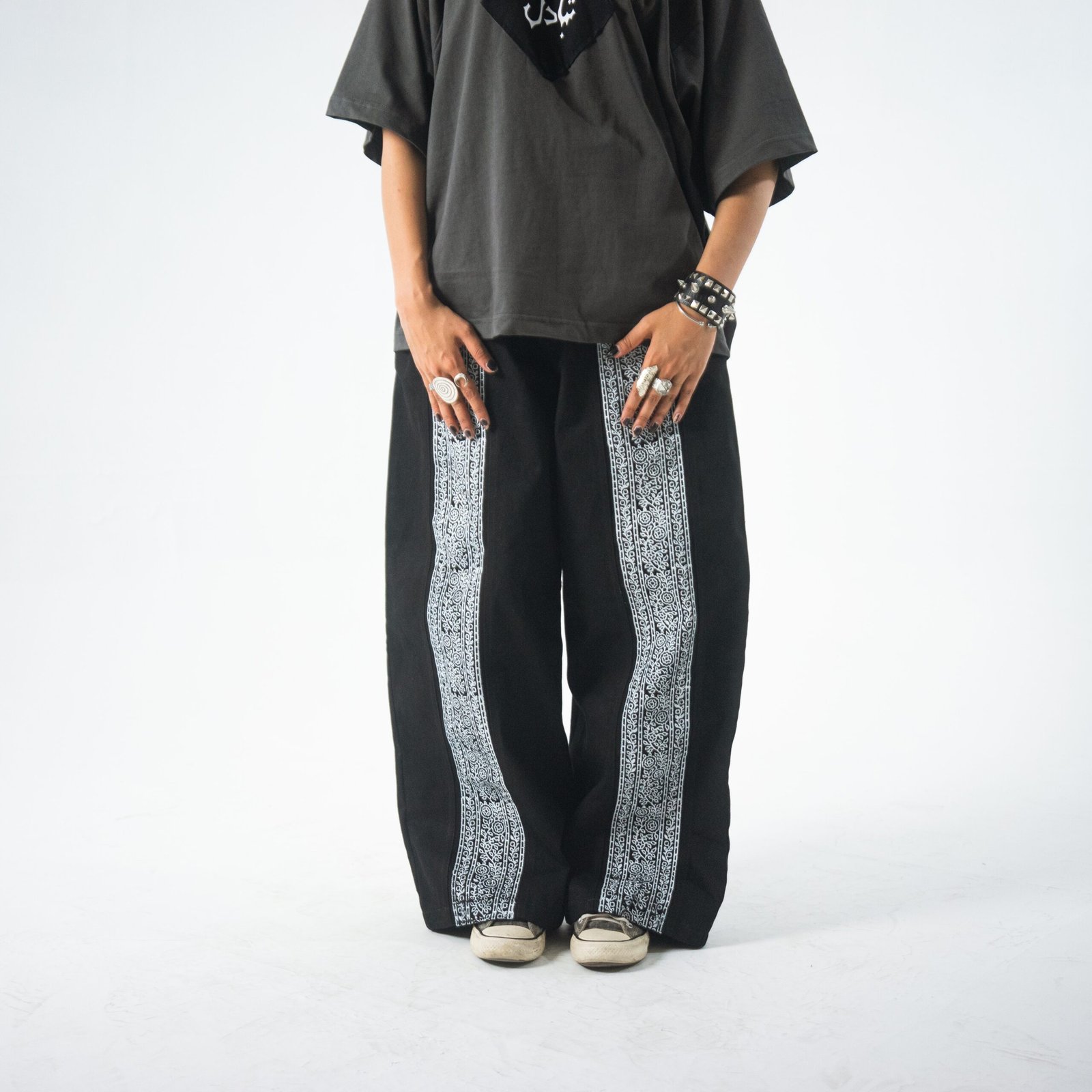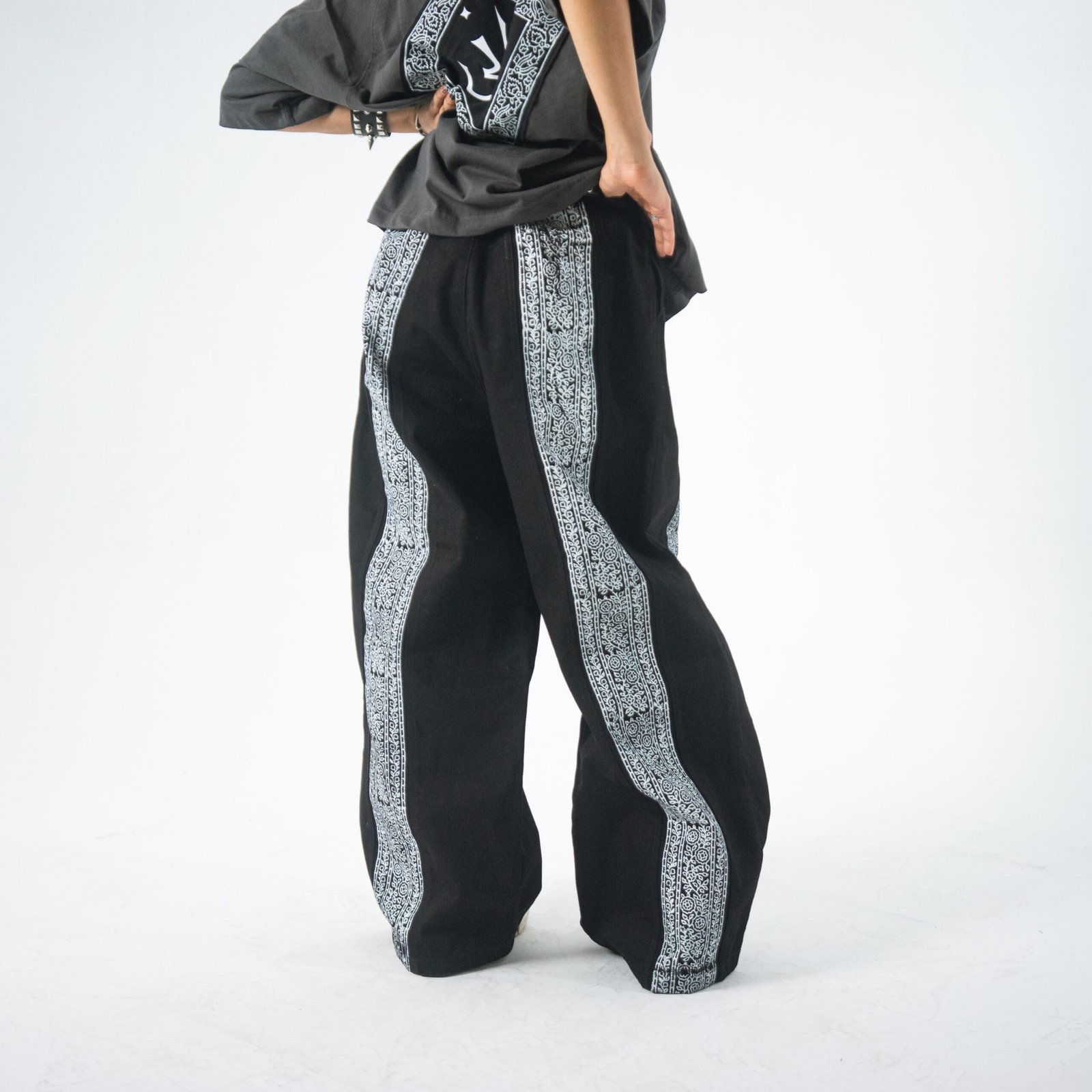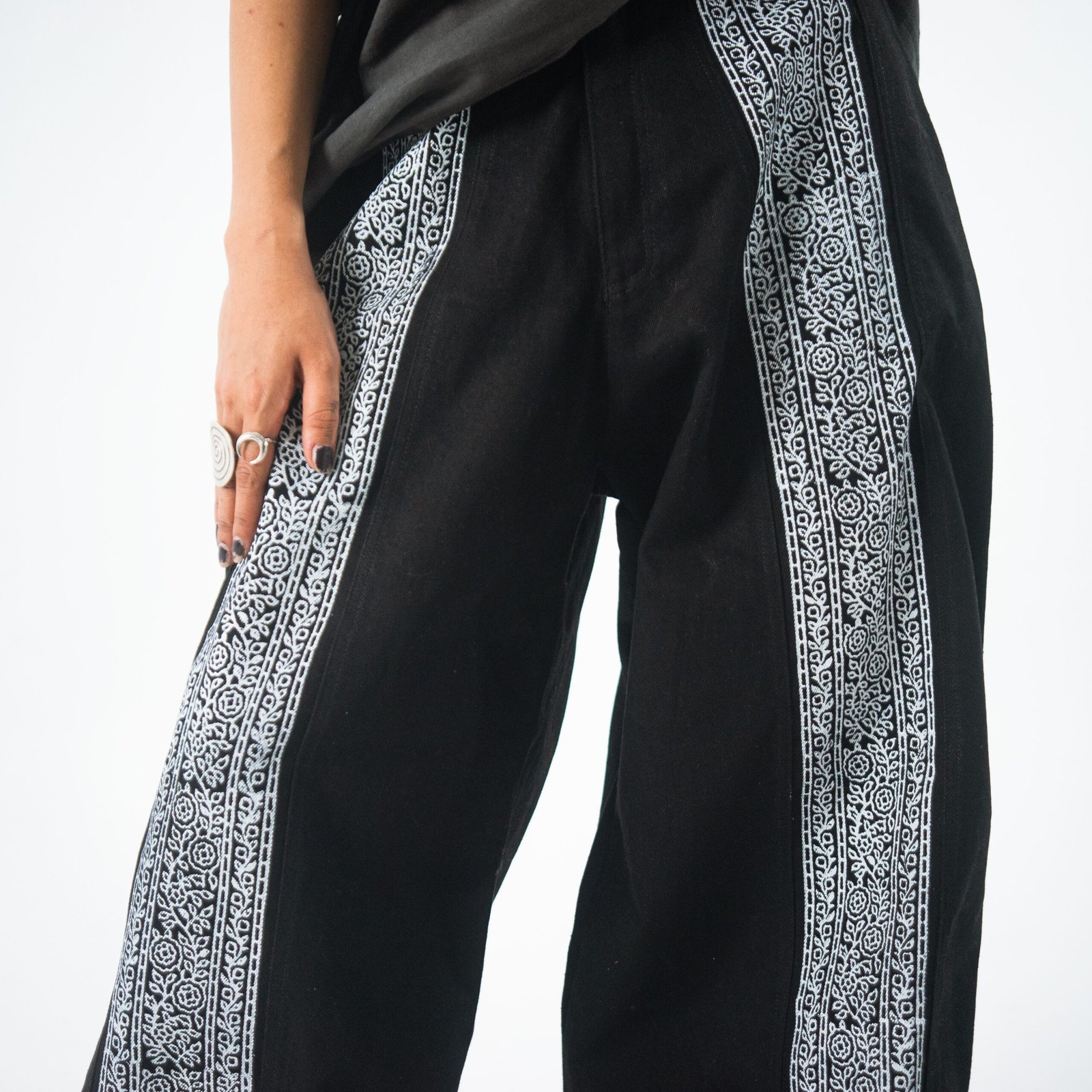 These statement pants are crafted with intention and cultural reverence. Each front and back leg is divided into three distinct panels, carefully stitched together to create a structured yet fluid silhouette. The center panels feature a hand blockprinted floral pattern, paying tribute to Pakistani traditional craftsmanship and the beauty of handmade textile art.