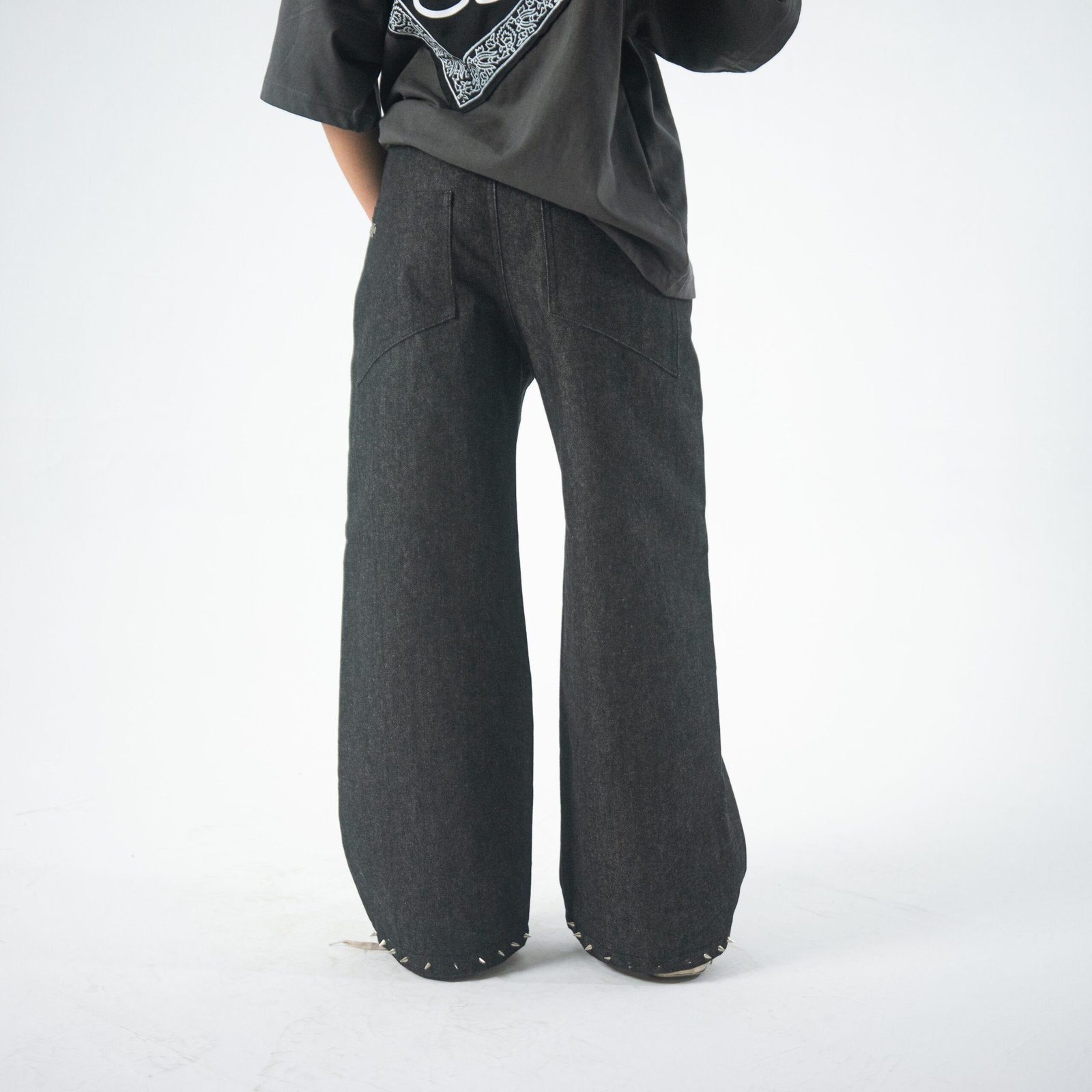 Crafted from premium heavyweight denim and stitched with extreme precision, these pants are inspired by the rock metal and punk culture. The silhouette is elevated by carefully placed metal studs, each applied by hand with meticulous attention to detail—turning every inch into a statement of craftsmanship and intent. Bold yet refined, this piece stands at the intersection of utility and art, offering a tough, distinctive look without compromising on thoughtful construction. Designed for those who embrace detail, process, and presence in what they wear.