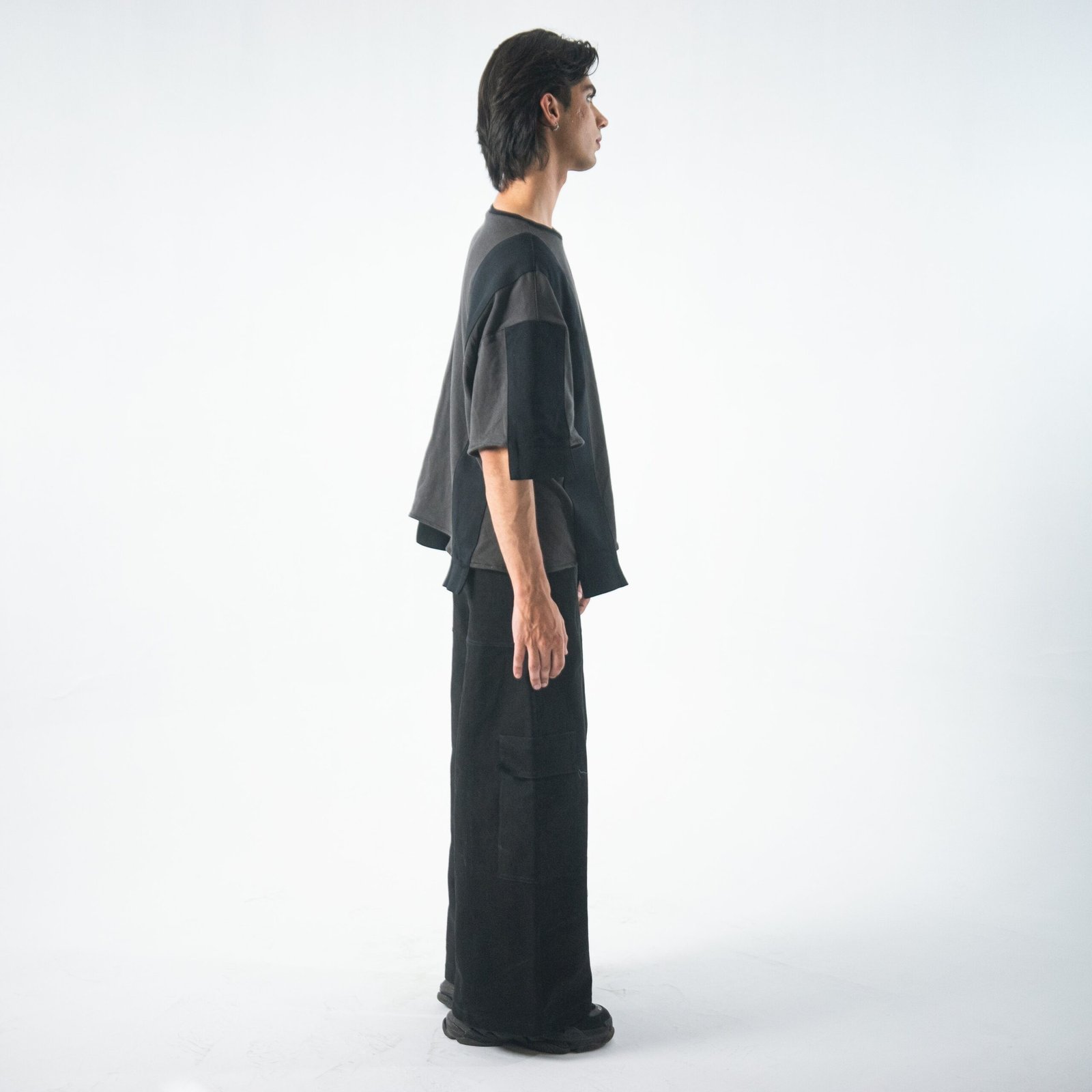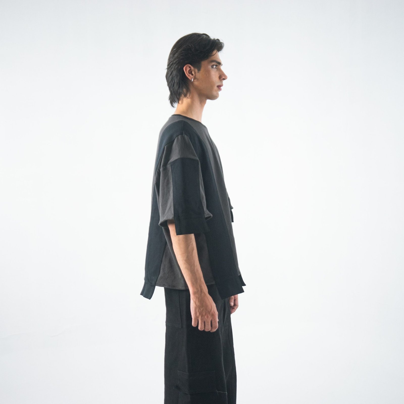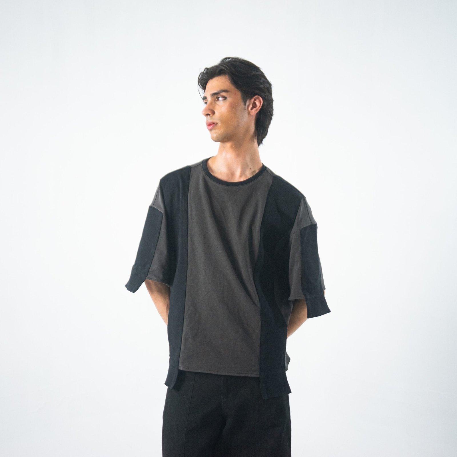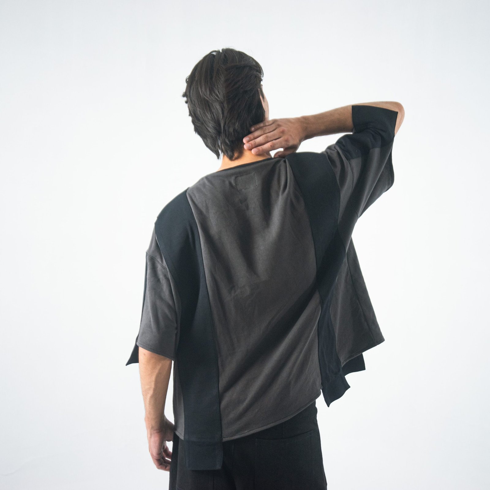 A bold exploration of form and structure, this tee features a striking grey and black contrast with a clean single-stitch finish and a highly experimental, one-of-a-kind silhouette. Designed to challenge the ordinary, its shape and cut create a standout look that redefines everyday wear. Minimal in detail but rich in character, this piece is made for those who see clothing as a form of self-expression. It’s more than just a t-shirt—it’s wearable art. This piece isn’t just clothing—it’s a statement against waste and a reminder that art and sustainability can coexist.